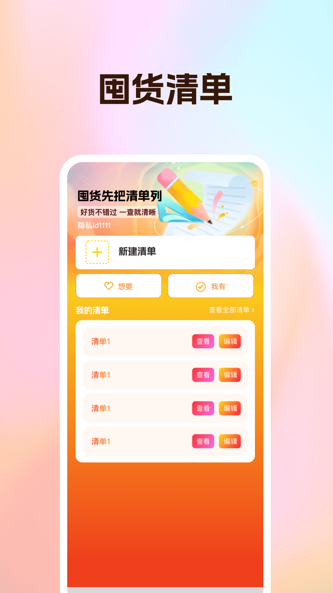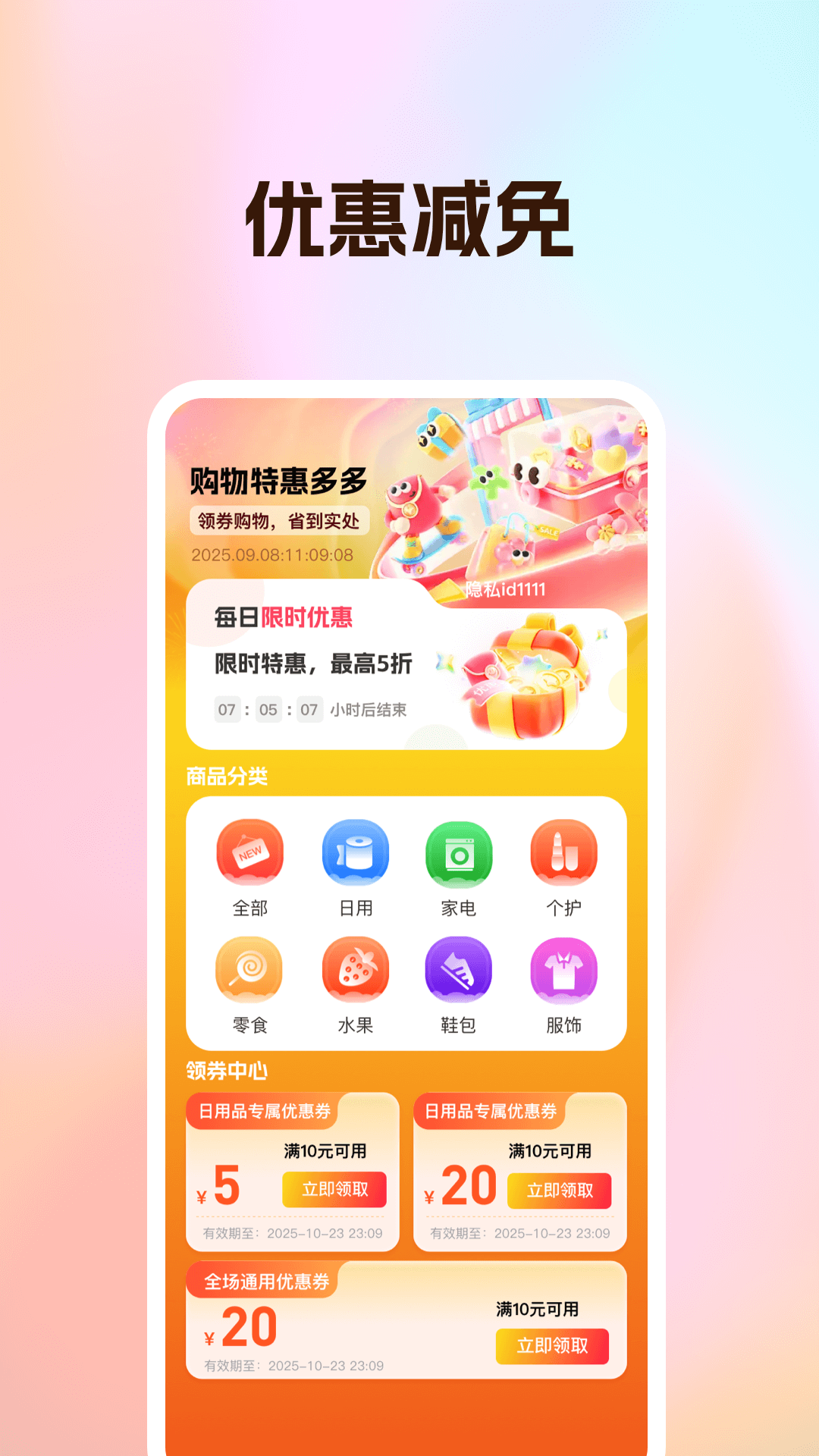 本应用核心提供领券优惠券购买商品服务,每个商品都有专属的优惠券,用户领取后在付款时抵扣,应用内每日都提供各品类的商品的通用券各一张可以和商品专属券叠加使用,此外还设有“想要”和“我有”功能,用户可以添加自己想要的商品和已有的商品进行记录,应用内提供购物清单功能便于用户在购物前列清购买商品,应用还有查件记账功能,用户可以查询自己的快递物流情况,还可以记录购物的消费支出情况